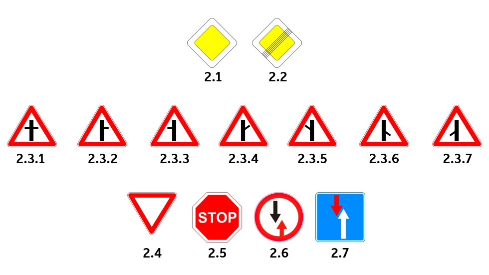 - Уступите дорогу — требует от водителя уступить дорогу транспортным средствам, движущимся по пересекаемой дороге.