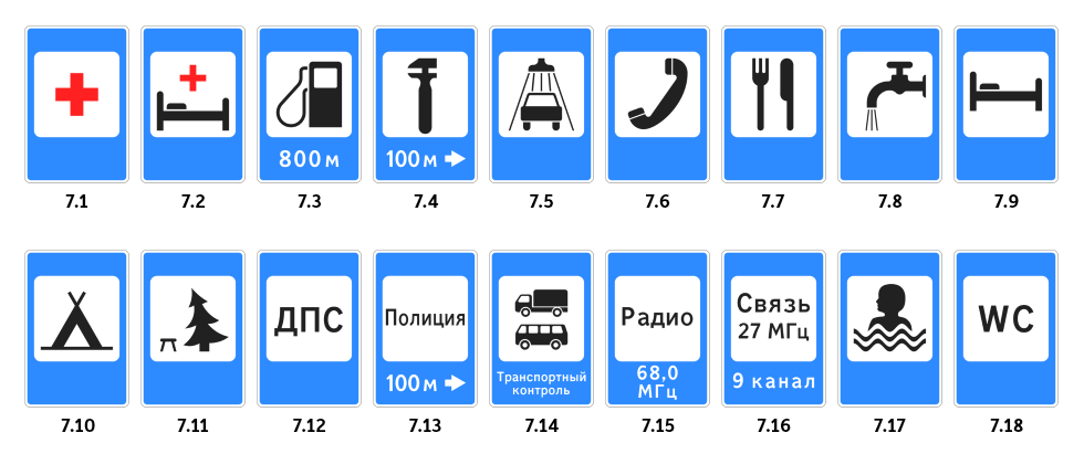 Знаки сервиса — это особая категория дорожных знаков, которые информируют водителей о наличии рядом с дорогой различных объектов и услуг. Они помогают быстро сориентироваться на маршруте, найти автозаправку, гостиницу, пункт питания или медицинскую помощь. Знаки сервиса имеют прямоугольную форму с синим фоном и белыми символами, что делает их заметными и легко узнаваемыми среди других дорожных обозначений.