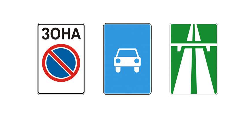 - Зона действия — указывает протяжённость участка дороги, где действует знак.