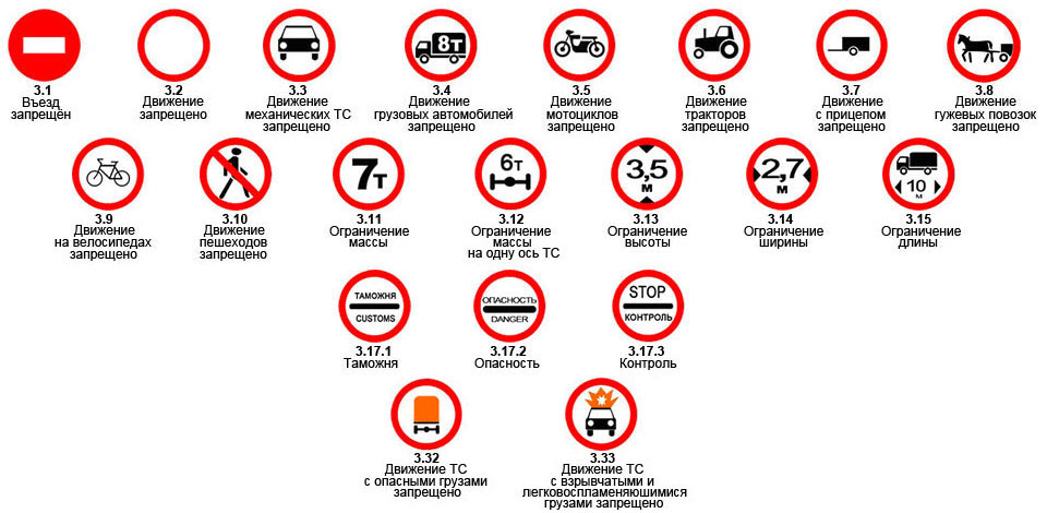 - Знак 3.1 «Въезд запрещён» — запрещает въезд всех транспортных средств в указанном направлении.