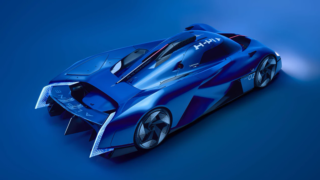 Двери в форме бабочки, а внутри литые ковшеобразные сиденья с гоночным рулевым колесом, украшенным переключателями и встроенным в него небольшим экраном. Яркий треугольник перед пассажирами меняет цвет и может отображать различные показания, такие как скорость или перегрузки. Alpine заявляет, что все еще изучает водородную энергию и способы ее интеграции в автомобили, в то время как ее спортивное подразделение Alpine Racing уделяет пристальное внимание изменениям в правилах соревнований, отмечая разрешение на использование водородных автомобилей в гонках 24 часа Ле-Мана 2027 года.