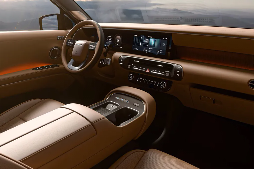 Интерьер еще больше отличается от предыдущего поколения и похоже еще больше продвигает флагман Hyundai по пути премиум-класса. Два 12,3-дюймовых цифровых экрана на одной панели обращены к водителю, но встроены в нишу на панели вместо более распространенного плавающего дизайна. Несколько физических кнопок расположены на центральной консоли, а дополнительные элементы управления можно найти на рулевом колесе.